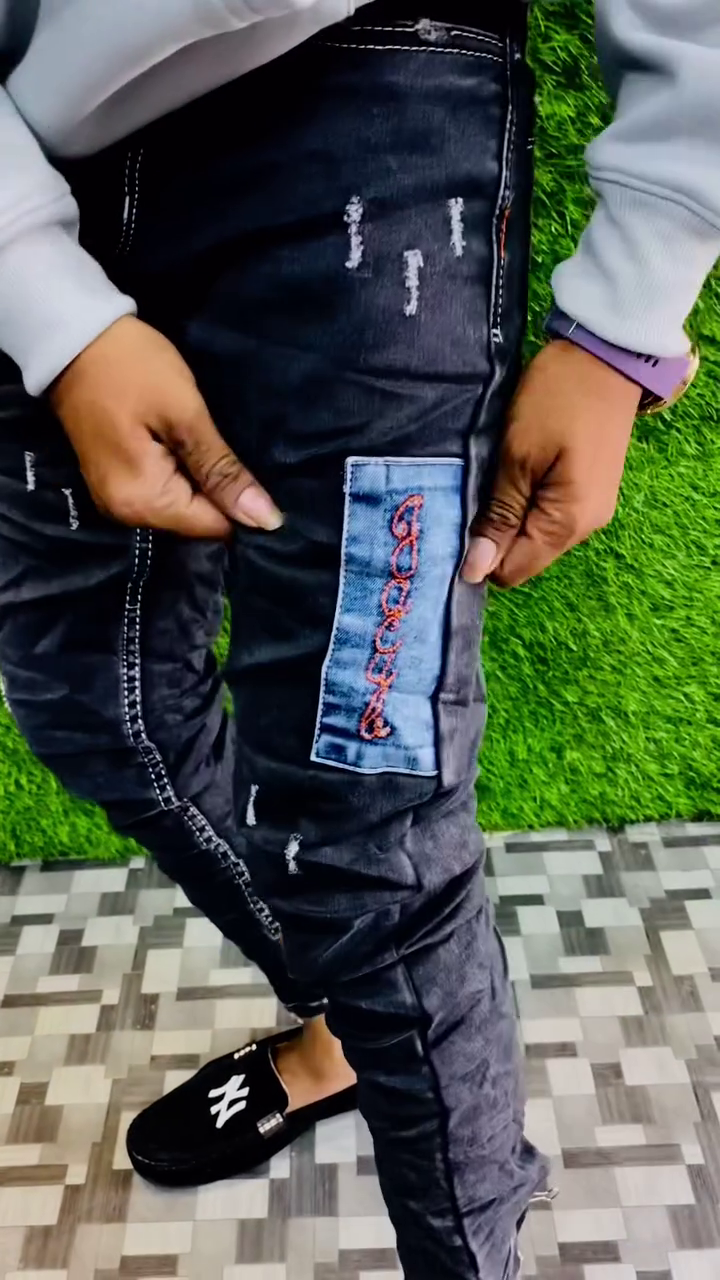 The distressed detailing and unique patchwork design give the jeans a trendy urban vibe, making them ideal for casual outings, parties, and weekend wear. The slim fit cut enhances the overall silhouette while ensuring comfort and easy movement throughout the day.